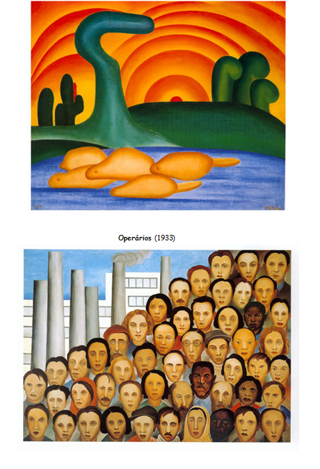 Abaporu - Este é o quadro mais importante já produzido no Brasil. Tarsila pintou um quadro para dar de presente para o escritor Oswald de Andrade, seu marido na época. Quando viu a tela, assustou-se e chamou seu amigo, o também escritor Raul Bopp. Ficaram olhando aquela figura estranha e acharam que ela representava algo de excepcional. Tarsila lembrou-se então de seu dicionário tupi-guarani e batizaram o quadro como Abaporu (o homem que come). Foi aí que Oswald escreveu o Manifesto Antropófago e criaram o Movimento Antropofágico, com a intenção de "deglutir" a cultura européia e transformá-la em algo bem brasileiro. Este Movimento, apesar de radical, foi muito importante para a arte brasileira e significou uma síntese do Movimento Modernista brasileiro, que queria modernizar a nossa cultura, mas de um modo bem brasileiro. O "Abaporu" foi a tela mais cara vendida até hoje no Brasil, alcançando o valor de US$1.500.00. Foi comprada pelo colecionador argentino Eduardo Costantini.